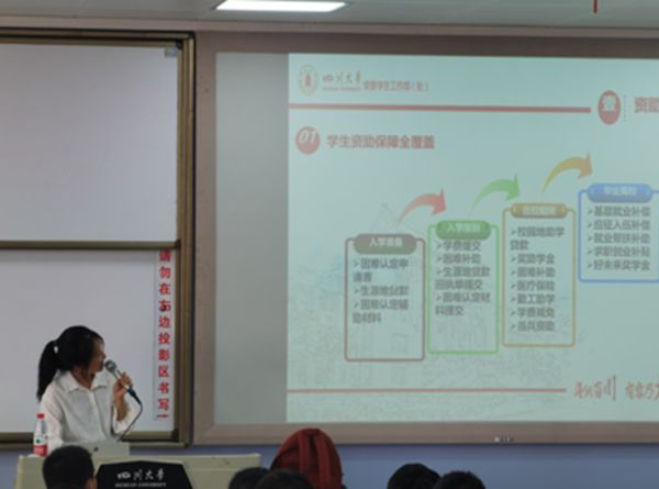 邀请学工部学生资助中心卢婕老师为2020级新生做资助政策宣讲。活动在江安第一教学C座407进行,2020级本科生以及新生辅导员参加活动。