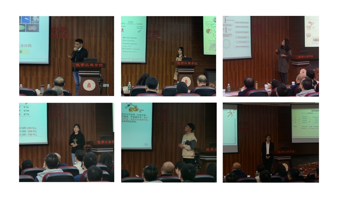 论坛正式开始后,博士组的同学们依次进行了精彩的报告。杜开峰教授课题组乔亮智的《多糖基微球色谱接枝的设计制备及构效关系研究》,张永奎教授课题组王旭倩的《氮化碳改性的生物合成羟基硫酸铁复合材料用于高效光催化还原Cr(VI)》,赵刚教授课题组张双双的《T7肽修饰的pH敏感性脂质体负载拉帕替尼及其抗肿瘤性能研究》,宋航教授课题组郭莹莹的《超声波对黑茶篦子多糖的降解规律和抗氧化影响的探究》,穆畅道教授课题组徐志朗的《pH响应型羟乙基淀粉纳米载药系统的构建及其抗肿瘤性能研究》和宋航教授课题组彭林彩的《基于磁性材料和碳纳米管改性的葡萄糖生物传感器的研究》,均得到与会专家的一致好评,演讲的同学和台下的老师互动交流频繁。这六个报告从不同的方面展示了同学们的研究思路和方法,为在场的低年级同学提高了很好的借鉴。