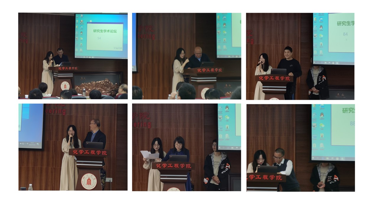 随后,张灵等10位硕士研究生依次进行了精彩的报告,研究主题多样,包括新的检测方法、新型吸附材料、新型抗菌材料和新型潜在药物小分子的筛选等。最后,经过学术委员会的一致评定,彭林彩和周慧荣获一等奖,王旭倩、徐志朗、卢涛、徐锦芳、赵良燊荣获二等奖,乔亮智、张双双、郭莹莹、张灵、吴玉婷、王文静、韩淼、梁超、吴进勇获三等奖。
