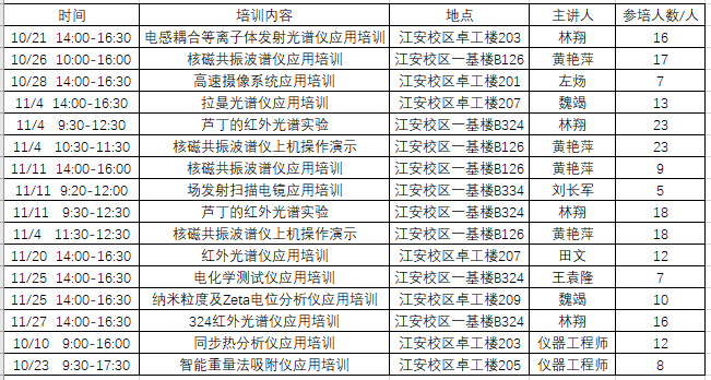 工程实验教学中心顺利开展了共享仪器设备应用培训16场,参培人员主要包括研一新生和高年级本科生共计209人次,培训信息如下表所示。