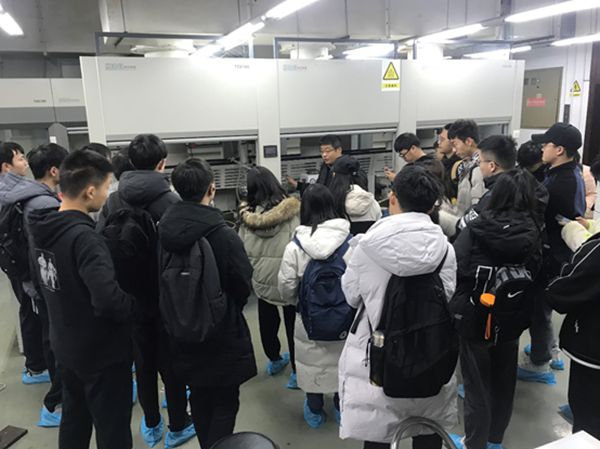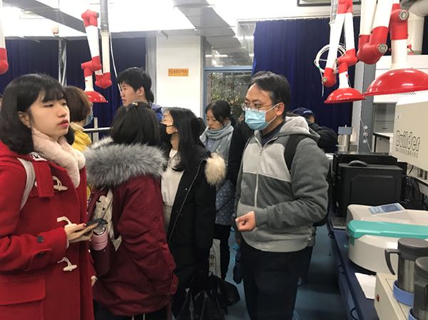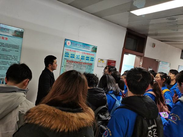 江安校区的化工学院的专业实验室。天气寒冷也抵挡不住同学们走进实验室的好奇与热情。参观分两批进行,工程实验中心的魏竭、林翔老师提前做好了准备,热情接待大家。