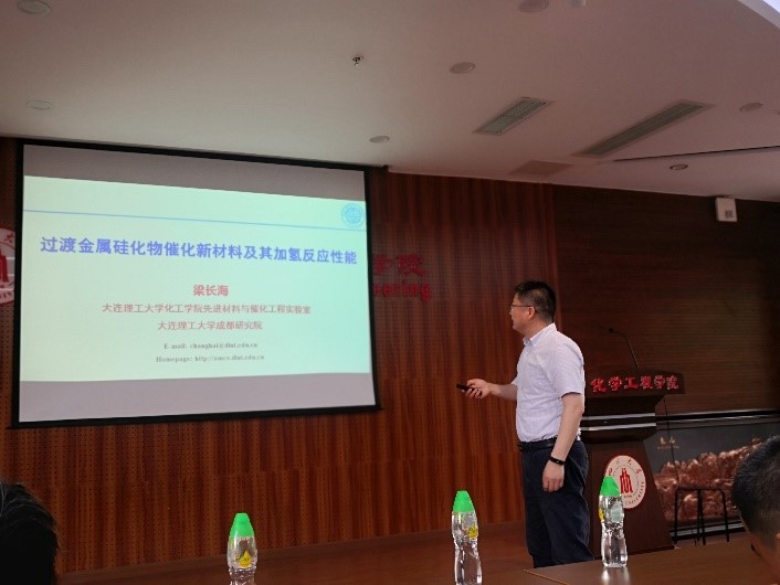 梁长海教授是大连理工大学学术委员会委员,大连理工大学成都研究院院长,入选国家级人才计划,入选四川省首批人才计划,主要研究领域包括催化新材料、精细化学品的多相催化合成,非常规资源高效清洁转化为染料和化学品,环境催化等。在本次报告中,梁长海教授向参会师生介绍了过渡金属硅化物的化学性质和物理性质和制备方法,以及课题组十多年来金属硅化物催化新材料在肉桂醛、苯乙炔、1,4-丁炔二醇、苯酐、CO、含硫化合物等的加氢脱硫、脱氧和选择性加氢反应中的性能,以及相应的构效关系分析,并对金属硅化物催化剂在产业化的应用进行了展望。报告结束后,参会师生积极发言提问,针对报告内容与梁长海教授展开了热烈的讨论,深入了解了金属硅化物材料在催化剂反应中的应用前景。