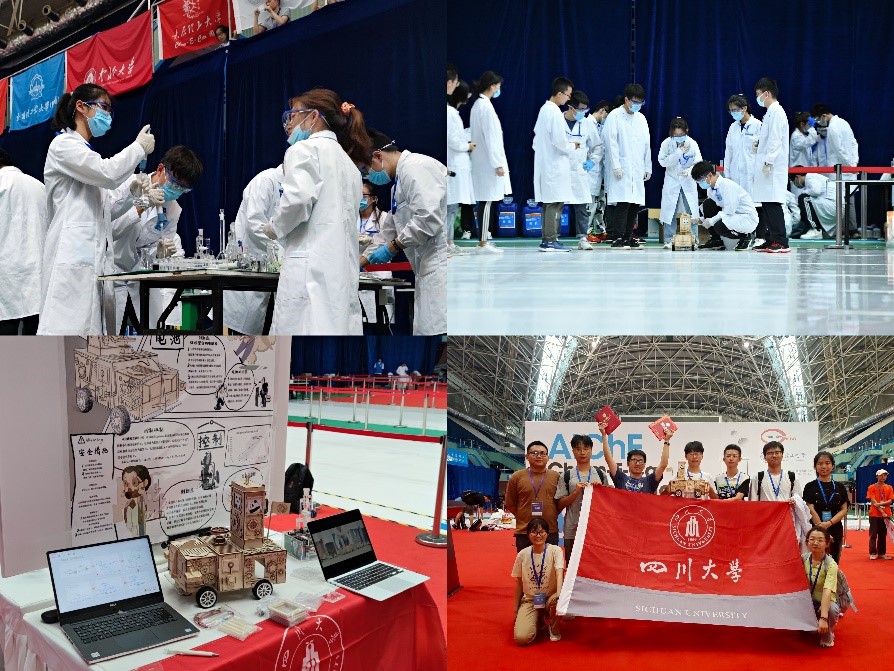 参赛当天,在海报及视频展示环节,“清一色”团队制作的1分钟短视频从众多视频中脱颖而出,独特的外观造型和自动化控制装置更是吸引了大批参赛师生前来取经。小车整体采用木制结构,采用燕尾榫和直榫连接,车体设计融合工业风和蒸汽朋克风,车身装饰零部件包含齿轮、仪表等工业元素和太阳神鸟、熊猫等成都文化标识,体现了四川的地域文化。在性能竞赛中,团队五名成员克服压力,在有限的准备时间内顺利制备并组装好电池、配制出碘钟反应试剂并加以验证和调整,并最终取得了性能比赛第六名的成绩。