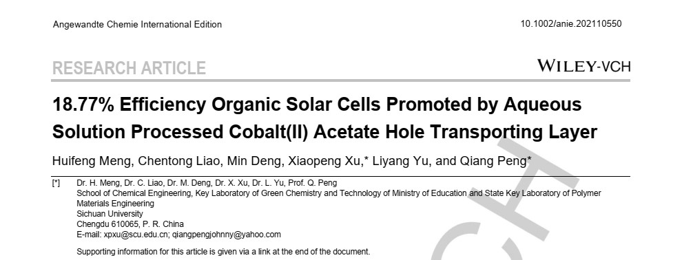 近日,化工学院彭强教授课题组在Angew. Chem. Int. Ed.上发表题为“18.77% Efficiency Organic Solar Cells Promoted by Aqueous Solution Processed Cobalt(II) Acetate Hole Transporting Layer”的研究论文。该课题组开发了一种基于醋酸钴的新型空穴传输层材料及其水溶液绿色制备工艺,将有机太阳能电池二元器件的能量转换效率提高到目前最高的纪录18.77%。91黑料