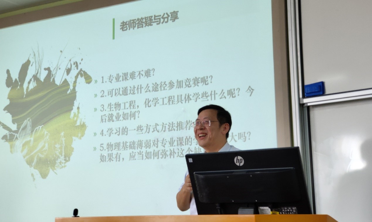 接下来就是两位班主任老师的答疑解惑与分享环节了。两位老师都深情回忆了自己的大学生活以及自己与化工的缘分。彭老师与同学们讲述了身为“川三甲”的故事,回忆川大与科大合并初期的冰与火,毕业合影时理科与工科服饰的区别等微妙的细节。彭老师还讲到自己“曲折”的学习经历,在新加坡感受到的地域文化差异和浓烈的家国情怀以及后来去到美国留学的丰富感受,更有在化工这片土地上的勤劳耕耘,硕果累累。杨老师着眼于同学们的大学生活,也分享了自己的“学霸”经历,劝诫同学们“难与不难,其实在于自己”,好好学习始终是大学生的第一要务。