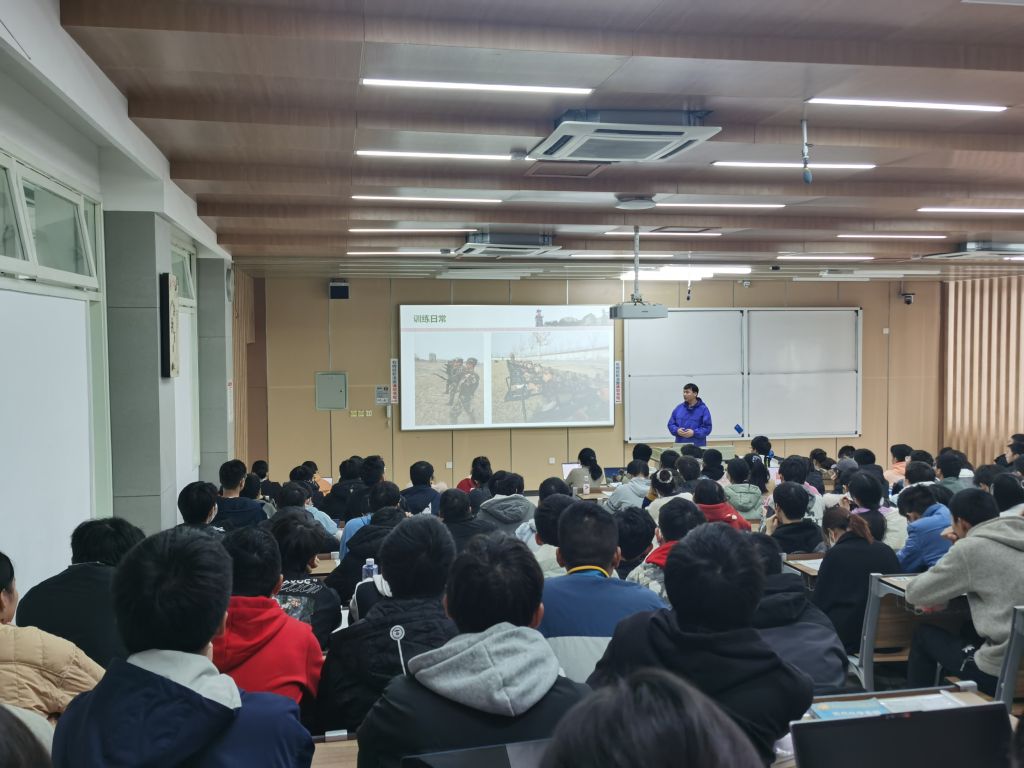讲座第二部分,由段振南发言。他曾服役于中国人民解放军勤务支援第83旅和特种作战第83旅,现为空天学院21级学生。他着重从军队的训练与生活角度,为同学们分享了军队的生活制度、作息准则、训练要求等等。他的讲解生动不失详尽,为同学们勾勒出了一幅令人无限向往的军队生活图景。“青春因磨砺而出彩,人生因奋斗而升华。”他希望同学们积极响应征兵号召,勇于担当时代大任,一次参军,一生无悔。