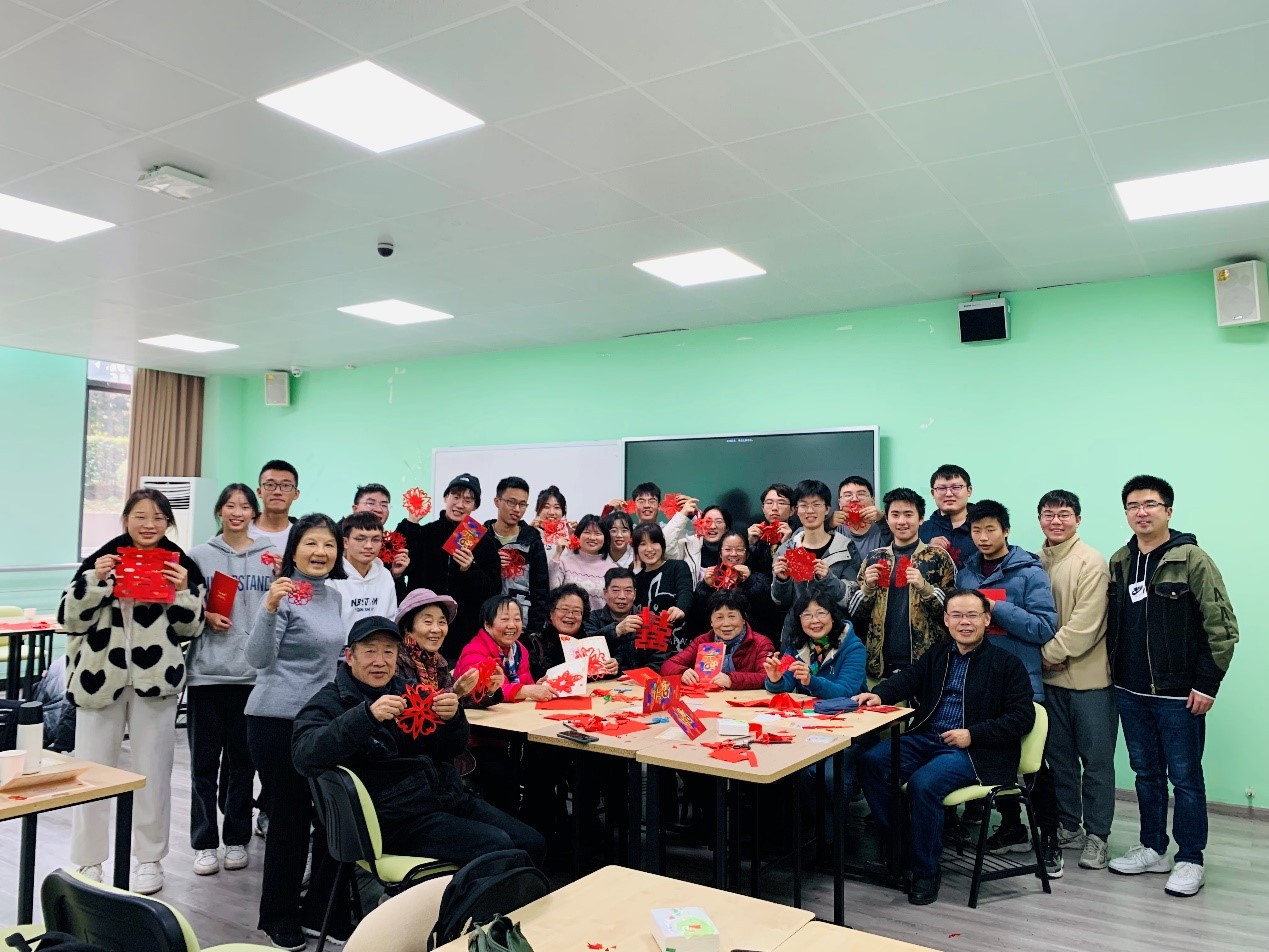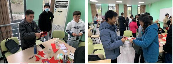 活动第一部分,首先,由主持人介绍二十四节气的内容和相关习俗,带领大家了解中华民族的节气文化。接下来,老教师们与学生们一起,以剪纸为媒介,进行了深入交流。活动过程中,师生不仅学习了传统的剪纸艺术,剪出了各式各样的作品,更是在合作中增进了相互的情感。老师们也在整个过程中对同学们的学习生活情况进行了进一步了解,针对期中考试情况,分享了他们的学习经验,并根据一些具体问题提出了建议。老师与同学在合作手工的同时进行交流,没有了拘束,呈现出一片祥和欢乐的气氛。