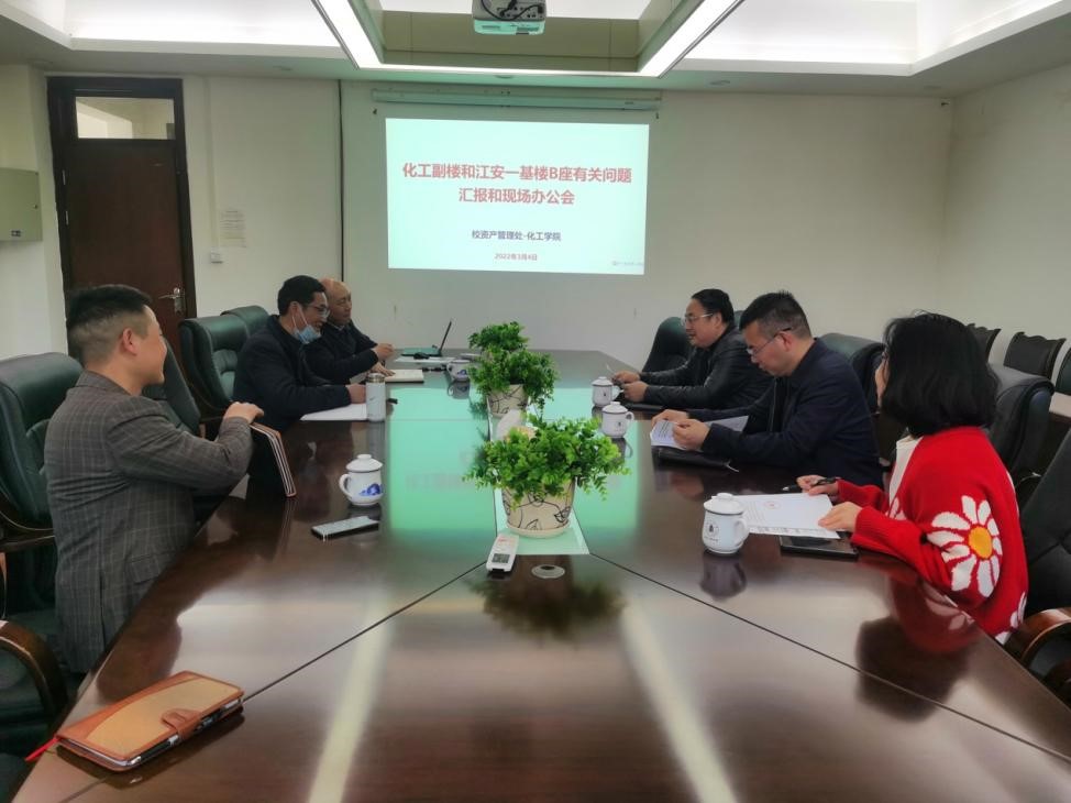 在李天友、郭孝东等陪同下,华国春一行实地踏看了化工副楼使用情况。在学院235会议室,李天友介绍了望江化工副楼和江安一基楼B座基本情况和存在的问题。赵长生提出,学院建设一流学科,需要良好的硬件条件保障,希望学校资产管理处支持学院建设,帮助学院一揽子解决目前存在的问题。双方就学院下一步开展公房管理工作进行了深入讨论和研究。华国春处长就化工学院目前公房情况和存在的问题做出积极回应,并开展了工作指导。