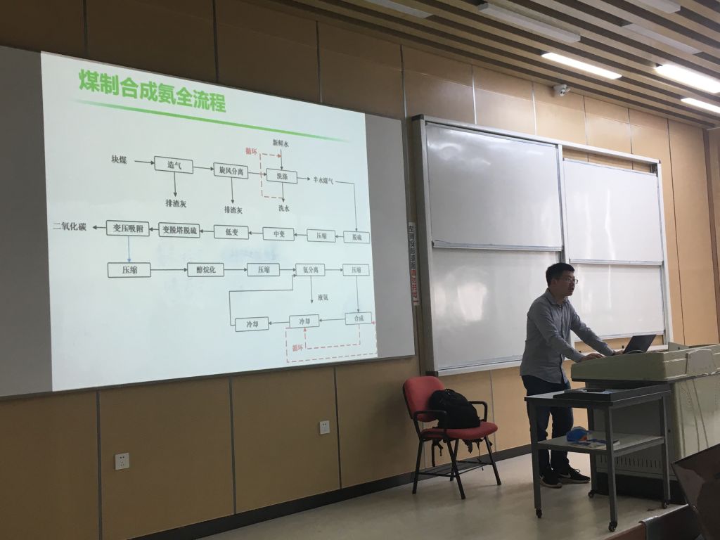 然后,许德华老师对仿真实习的内容进行了介绍,指出仿真实习包括了煤制合成氨工艺和湿法磷酸工艺两个部分内容。从合成氨的背景开始对该工艺的流程和发展进行了讲解,并结合化工工艺学、反应工程等学科内容对整个工艺流程进行了分析,现场提问与学生互动,由浅入深让学生掌握基本的工艺流程,也感受到化工生产在国民经济中的重要作用。最后,陈建钧老师强调了关于实习过程中的注意事项,着重强调实训过程中一定要佩戴安全帽和穿戴实习服装,在实习现场遵守指导老师安排,注意实训过程中的安全。