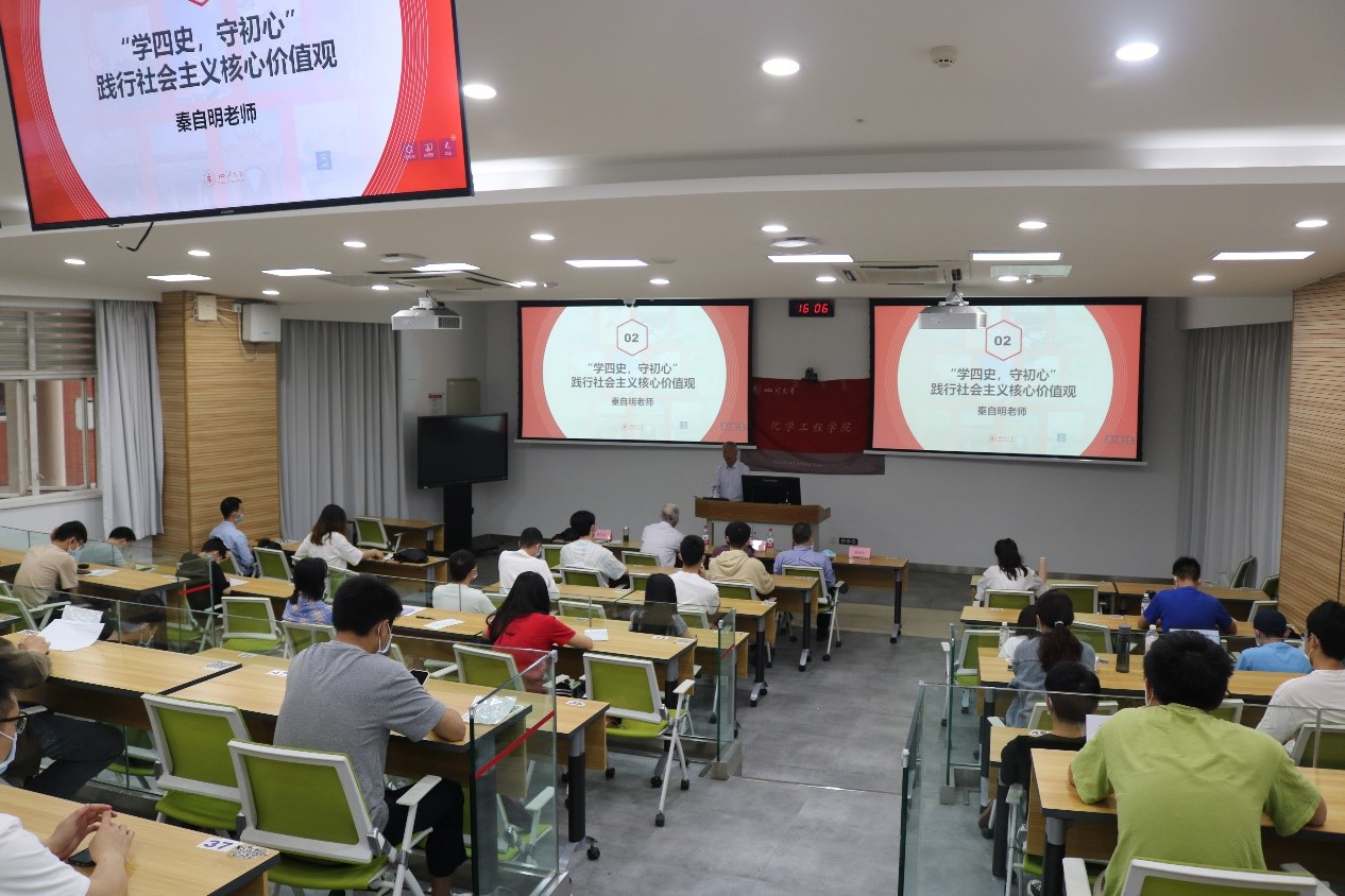 在望江校区基础教学楼C102教室,顺利开展以“学四史,守初心”践行社会主义核心价值观为主题的教育活动,主讲嘉宾邀请了校关工委秦自明老师。校关工委梁明征老师、傅运清老师,化工学院副院长唐盛伟老师、研究生辅导员李颖丽老师以及全体2021级硕士研究生同学参加了此次活动。
