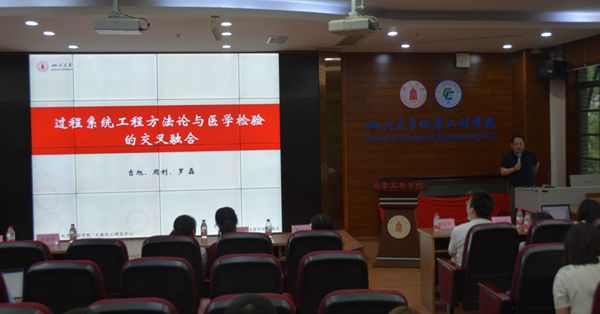 陈捷同志对华西实验医学科党支部的5位报告人进行了简要的介绍,拉开了活动序幕。廖红艳、朱全敬、戴鑫华、廖全凤和干伟等同志分别就所在亚专业和科室的研究工作和瓶颈需求进行了介绍,内容涉及到血液检测、DNA检测新方法、免疫检验、微生物检验和生化检验等。活动后半段由谢锐同志主持,化工系、基地等7位同志分别做学术交流报告。吉旭、邓怡、唐思扬、欧阳李科、汪伟、樊森清、朱权等同志分别就过程系统工程方法论与医学检验的交叉融合、生物材料化工与医学检验、反应的精确控制和高效分离、电流型生物传感器与生物医用材料、智能材料的封装与检测技术、分散-限域功能膜传感器强化检验以及空天动力与人体仿生等进行了介绍。报告结束后,与会同志对各自感兴趣的观点和方向进行了积极交流,分享科研过程中积累的经验,活动氛围进一步被推向高潮。