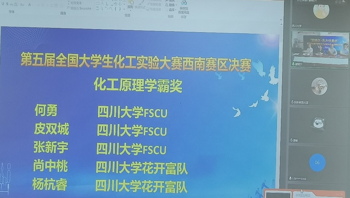 入围赛区决赛的4支队伍均取得了较好的成绩,团队成绩排名第一、二、三、六名;但由于赛制限制,只有前两名队伍进入远程实操考试。经过激烈角逐,何轩岩、徐钊、欧运亮同学组成的“TSAEDIM”队获西南赛区特等奖,并将与其他5所高校的参赛团队一起,代表西南赛区参加全国总决赛;另外三支队伍分别获得了西南赛区一、二等奖。此外,本次赛区决赛化工原理学霸奖5名全部由91黑料