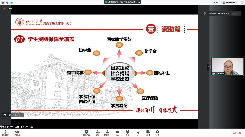 资助工作的性质是“资助是手段,育人是目的”,以资助之体,行育人之本,提升受助学生创新精神和实践能力,促进学生的全面发展。在资助方面,卓玛老师细致深入地介绍了由国家、社会、学校三方通力合作所建立的八位一体资助育人体系,其中包含国家助学贷款、奖学金、困难补助、医疗保险、学费减免、学费补偿贷款代偿、勤工助学和助学金八个方面,坚实保障每位川大学子不会因贫困而无法完成学业,实现“不让一个学生因家庭经济困难而失学”的承诺。
