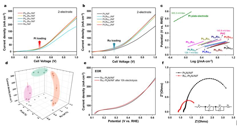 图1 (a)&(b)不同PtRu比例催化剂的乙醇氧化LSV曲线;(c)不同PtRu比例催化剂的乙醇氧化Tafel曲线;(d) EOR电流密度;(e)稳定性测试结果;(f) EIS测试曲线