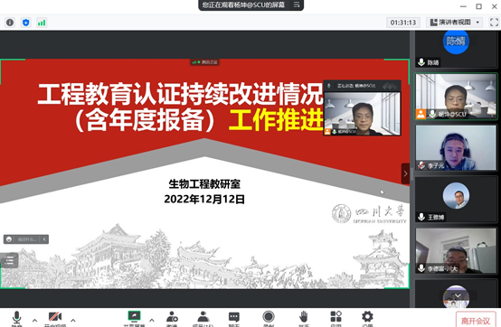 首先,杨老师向参会教师介绍了生工专业工程教育认证持续改进情况报告准备的进展情况。随后,各位老师对自己在准备报告各环节材料过程中碰到的问题和解决措施进行了梳理和讨论。生物工程专业于2020年1月通过工程教育认证,目前已经到了需要提交持续改进情况报告的第三年。最后,大家根据校外专家的送审意见,对2023版生生物工程专业培养方案的改进和完善进行了讨论。
