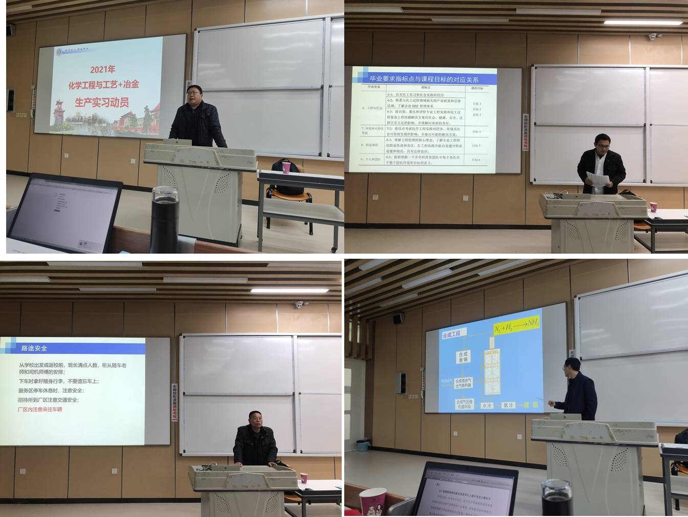 在动员大会上,吴振国老师对本科生生产实习课程目标、课程基本内容、实习安排、实习地点等进行了介绍,强调了实习安全与注意事项。随后,吴振国和许德华老师分别对本次实习参观工厂的工艺进行了介绍。本次实习在鼎盛锂业主要实习参观锂辉石提取碳酸锂生产工艺,在龙佰钛业实习参观硫酸法钛白工艺,在德阳龙蟒大地实习参观磷酸盐生产工艺,在重庆天然气净化厂实习参观天然气脱硫及硫磺回收工艺。两位老师分别从各个工艺的背景、工艺路线及关键反应等方面进行了介绍,并强调了在工厂实习的重点内容。