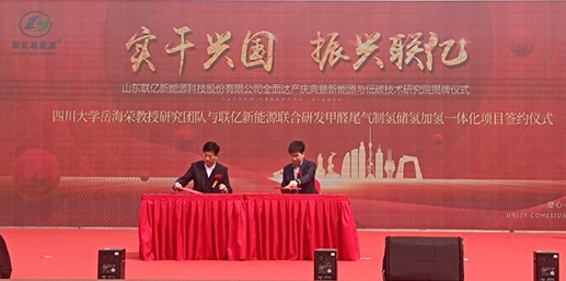 联亿新能源总经理王建信对新能源与低碳技术研究院的成立表示期待,提出将启动氢能循环利用项目,将甲醇氧化制甲醛过程中副产的尾气进行综合利用,制取高纯氢气。希望双方能够在UFC和氢能源工作中探索出一条新路子,推出了绿色制造脲醛胶,实现了新能源的富能量生产UFC和制氢工艺。