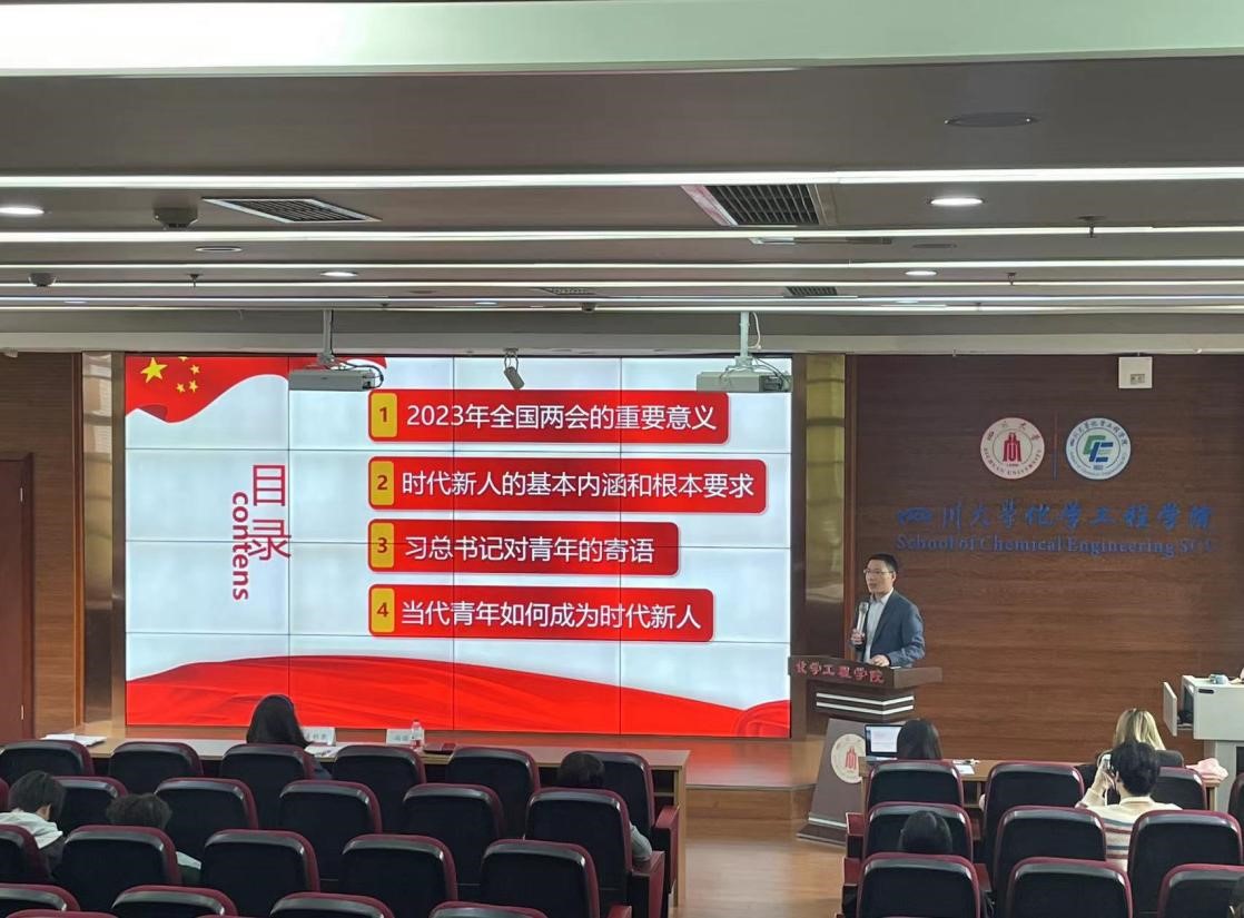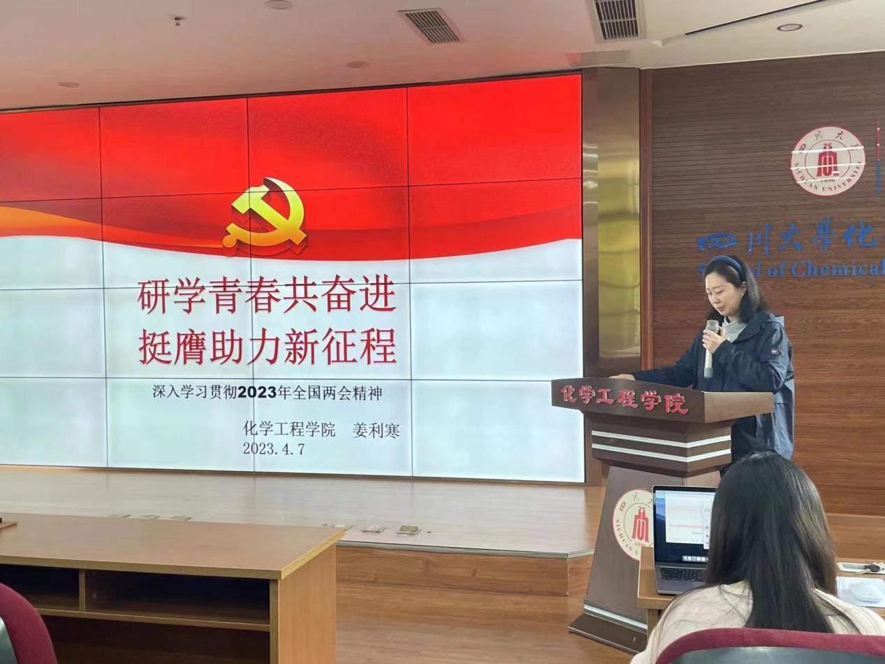 姜利寒老师首先从坚定信心、团结一心、奋跃而上三个关键点为大家讲解了2023年全国两会看点,党的二十大勾画的一幅幅中国式现代化图景让人满怀期待。其次,姜老师重点展示了2023年全国两会上的川大声音,通过讲述汪劲松校长、石碧院士、许唯临院士等人在全国两会上提出的建议,让同学们深入了解全国两会上的川大力量,也让大家意识到唯有珍惜时光、努力学习,用知识武装自己,才能更好地肩负起中华民族伟大复兴的重任。最后,姜老师号召当代青年要凝聚起建设中国式现代化的磅礴力量,实现从优秀到卓越的升华,要更加紧密地团结在以习近平同志为核心的党中央周围,坚定历史自信,增强历史主动,坚持守正创新,保持战略定力,发扬斗争精神,勇于攻坚克难,不断为强国建设、民族复兴伟业添砖加瓦、增光添彩。