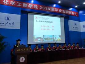 典礼仪式上,优秀本科毕业生代表杨柯回顾了与川大共同成长的岁月,难忘时光和精彩的生活片段,表达了对毕业生们的美好祝愿,对师生、对学校的感恩和对母校依依惜别之情,并表明要更加拼搏向上,不辜负学校的悉心培养,与时俱进,立德修身,将自身的发展同国家发展、民族振兴紧密结合起来,争做有理想、有本领、有责任、有担当的优秀青年。随后,入选“3+2+3”本硕博连读计划的优秀博士毕业生代表李响回首了求学路上拼搏岁月以及出成果时的欣喜之情,深切向悉心培育我们的领导、老师,表达最衷心的感谢;向辛勤付出的父母,表示最崇高的敬意;向相识互助的同学,表达最诚挚的祝福,并与全体毕业生共勉,努力在自己的领域做前百分之二十,不辱化工之名,让优秀成为一种习惯。