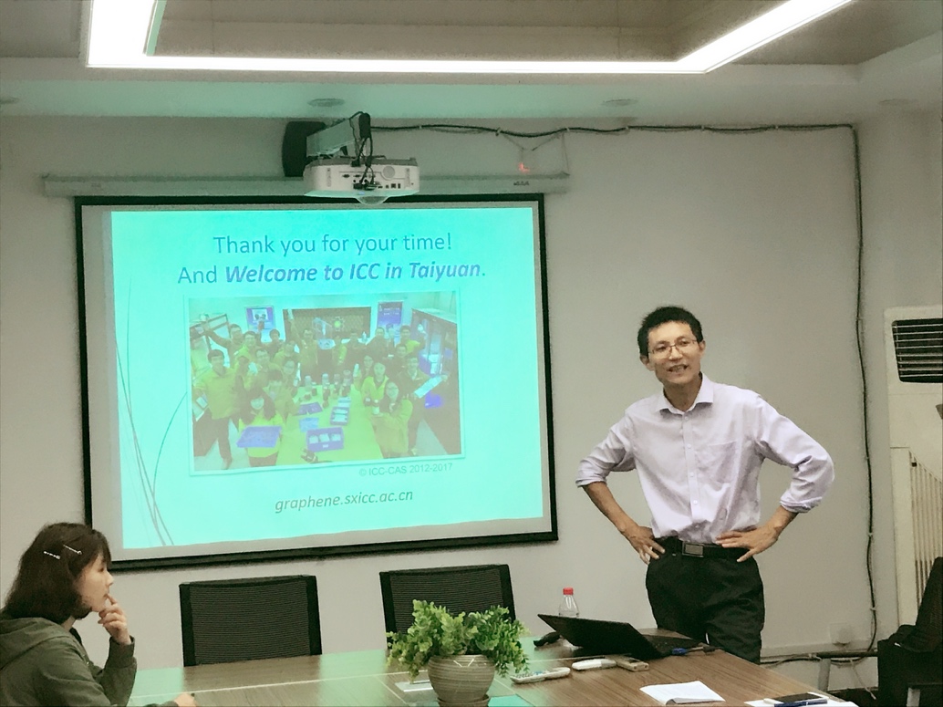 陈成猛副研究员首先介绍了中国科学院山西煤炭化学研究所及其团队在太原建成的吨级氧化还原石墨烯中试线;随后,他介绍了石墨烯及其衍生物的不同制备方法、规模化生产以及石墨烯在超级电容器储能、导热和结构增强等领域的最新研究进展;最后向师生们介绍了其课题组参与的石墨烯标准化制定。