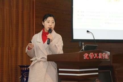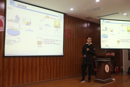 之后,论坛正式开始。来自李晖教授课题组的博士生孙巧媚为大家做了题为《食品添加剂与生物大分子的分子识别过程》的主题报告,介绍了8种食品添加剂在进入人体之后与蛋白质和DNA识别的过程分析;穆畅道教授课题组的博士生葛黎明的报告《纳米银的绿色制备及其在抗菌型胶原基复合材料中的应用》,为大家介绍了使用绿色还原剂双醛黄原胶制备纳米银,并将其应用于胶原基复合海绵材料,该材料在人体具有广泛应用前景;来自埃塞俄比亚的留学生Nigussie Alula Yohannes做了题为《Doping Metal Organic Frameworks with Ionic Liquids for Adsorption of Tetracyclines from Water Samples》的报告,他表示离子液体目前在各个领域均具有广泛地应用,将离子液体掺杂金属有机骨架多孔材料可以提高其吸附存储性能,拓宽其应用领域。之后,他表示很高兴参与这样的论坛,也从其他博士的报告中学到了很多东西,希望之后可以继续加强与其他同学的交流。之后,冯雪婷、胡婉蓉、雷金凤、龚贵东、李盼禹分别为大家做了《用磁性离子液体选择性提取和分离茶叶中的茶多酚》、《剩余污泥的减量与资源化》、《明胶基自愈合水凝胶的构建》、《透明质酸包裹环钯化合物纳米胶束的制备及其抗肿瘤活性研究》和《餐厨垃圾的资源化综合利用》的报告。