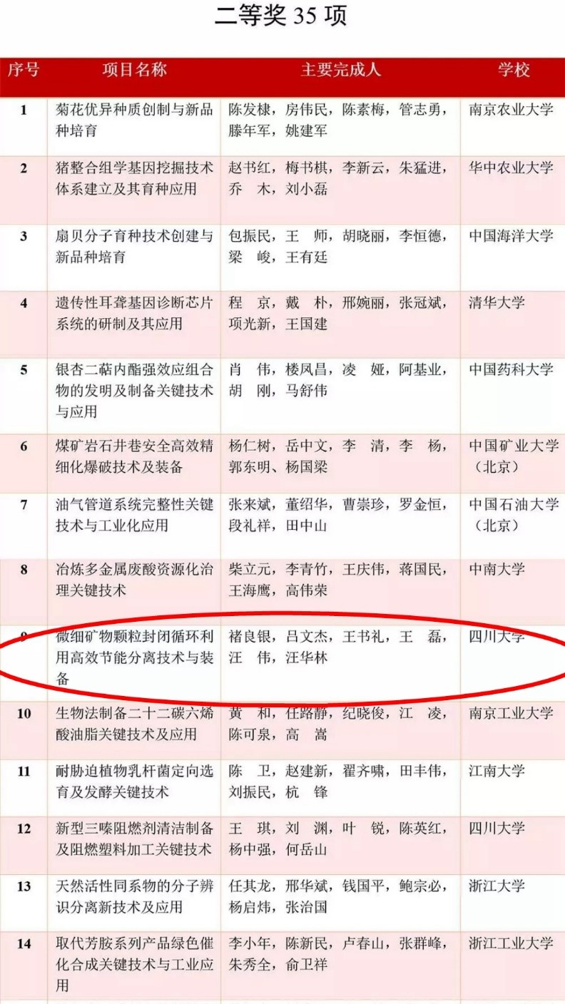 学院褚良银教授团队牵头完成的“微细矿物颗粒封闭循环利用高效节能分离技术与装备”项目喜获“国家技术发明二等奖”。让我们为褚良银教授团队表示祝贺!