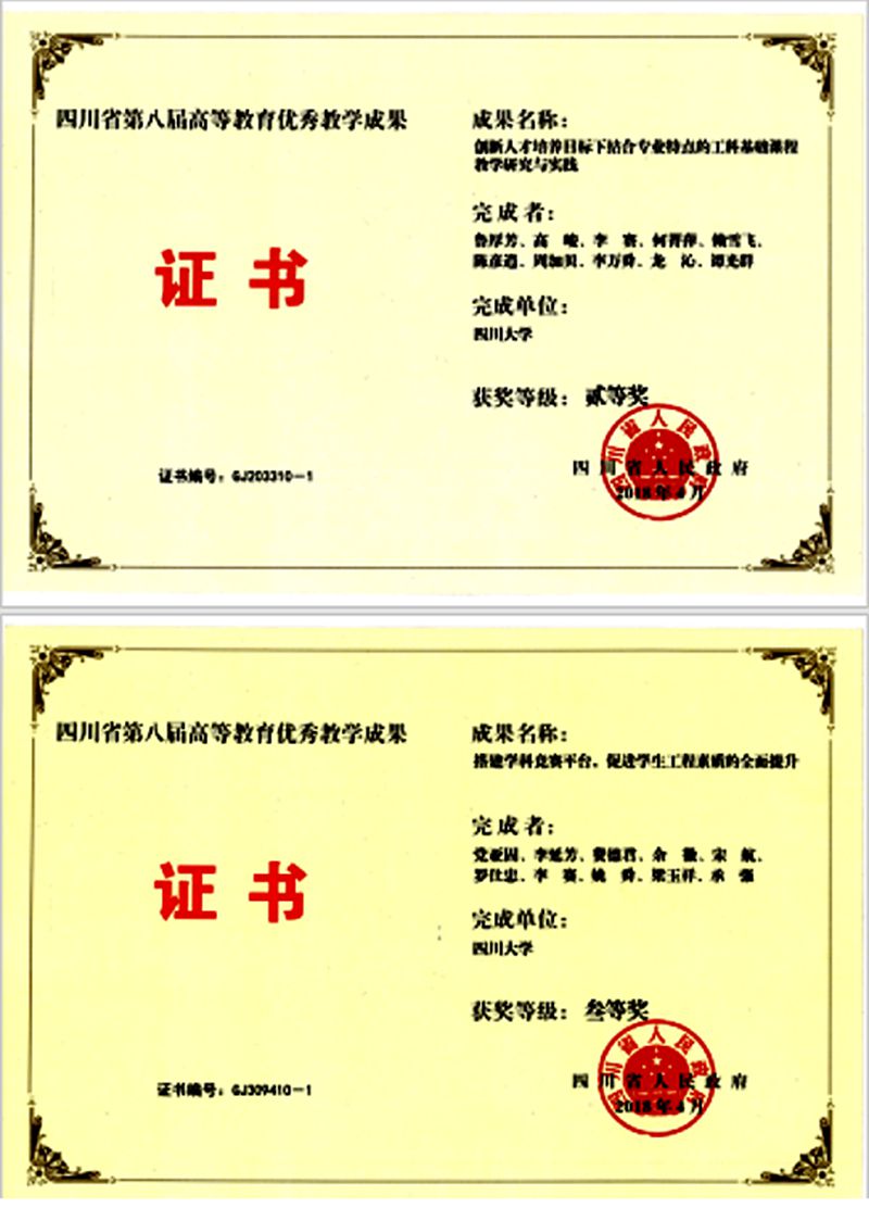 获得四川省第八届高等教育教学成果奖两项,其中二等奖1项、三等奖1项。