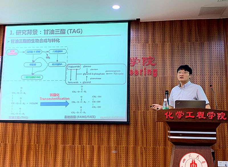费强教授课题组利用产油酵母菌和嗜甲烷菌作为底盘细胞,通过两阶段高密度发酵、旁路基因敲除和优化代谢途径等策略,在有效降低底物抑制作用的同时,提高了碳代谢通量和底物有效利用率,将来源于餐厨垃圾厌氧发酵过程中生产的挥发性脂肪酸混合液和沼气中的甲烷高效生物合成为生物油脂。研究为实现生物燃料的合成路线替代和餐厨垃圾增值开发和资源化利用提供了新的思路。费强教授的报告详细地介绍了其在高效生物转化有机废弃物方面的工作,令在座的老师和同学都受益匪浅。