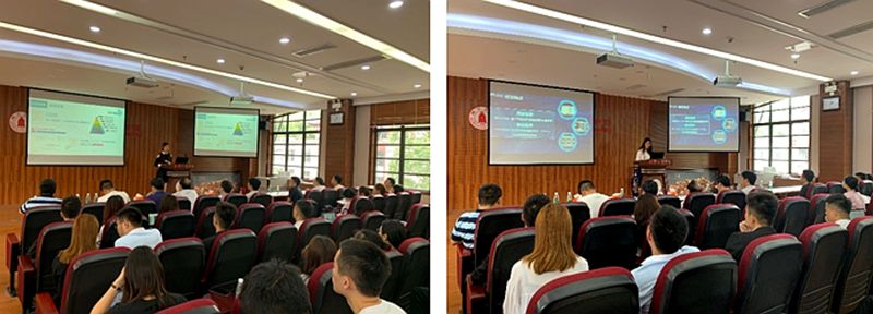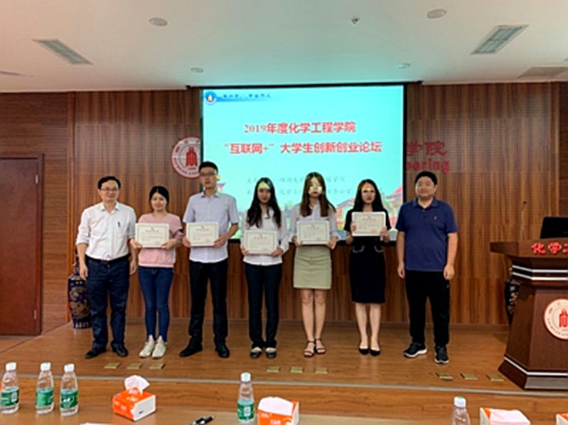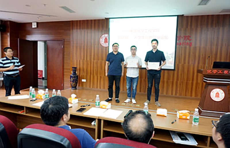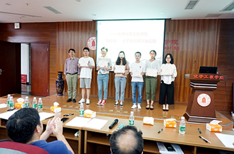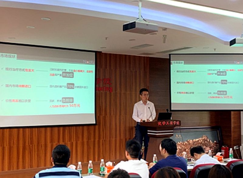 本次论坛首先邀请了第三届中国“互联网+”大学生创新创业大赛国赛金奖项目“Niceky自抗凝性高通量血液透析器”成员刘志航同学进行路演。刘同学以国赛标准从项目背景、项目发展情况及未来预期等方面为大家做了详细介绍,并分享了参赛经验。之后,化工学院入围2019年“互联网+”大学生创新创业大赛校赛的11支参赛团队按顺序进行项目路演,对项目产品/服务介绍、市场分析及定位、商业模式、营销策略、财务分析、风险控制、团队等进行了介绍。