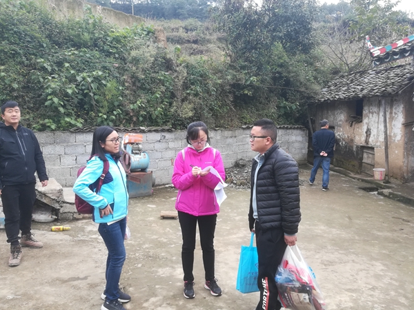 驻村干部席旸玺老师、吴永超老师以及当地干部的陪同下,深入格布村开展走访慰问。工作组逐一走访了定点扶贫负责的13个彝族贫困户家庭,与彝族群众交谈,询问他们的家庭情况、收入情况、收入来源和帮扶需求,并对国家“三建四改”帮扶支持项目的落实情况进行核查。走访慰问期间,工作组为每位贫困户发放了慰问品。